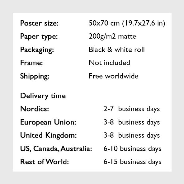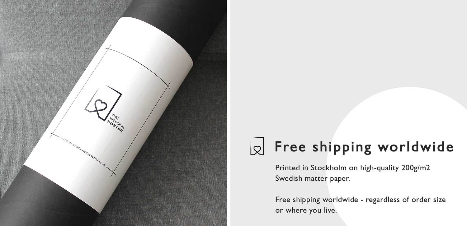 All our posters are printed in Stockholm on high-quality Swedish 200g/m2 matte paper. The Wedding Poster is wrapped in a solid black tube embraced by the black and white The Wedding Poster logo, ready to be given away as the perfect wedding gift. To make sure the black tube is delivered intact it's delivered and sent inside an external package.