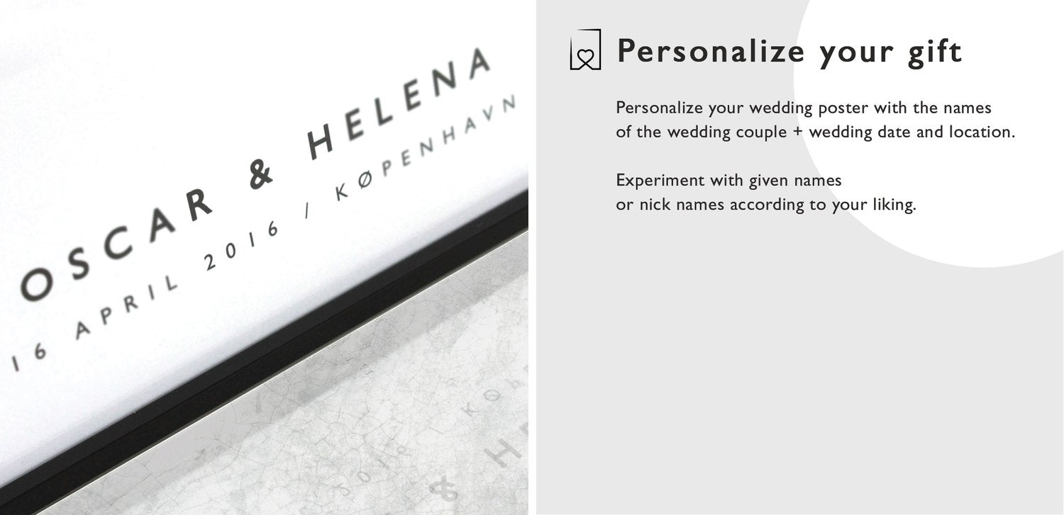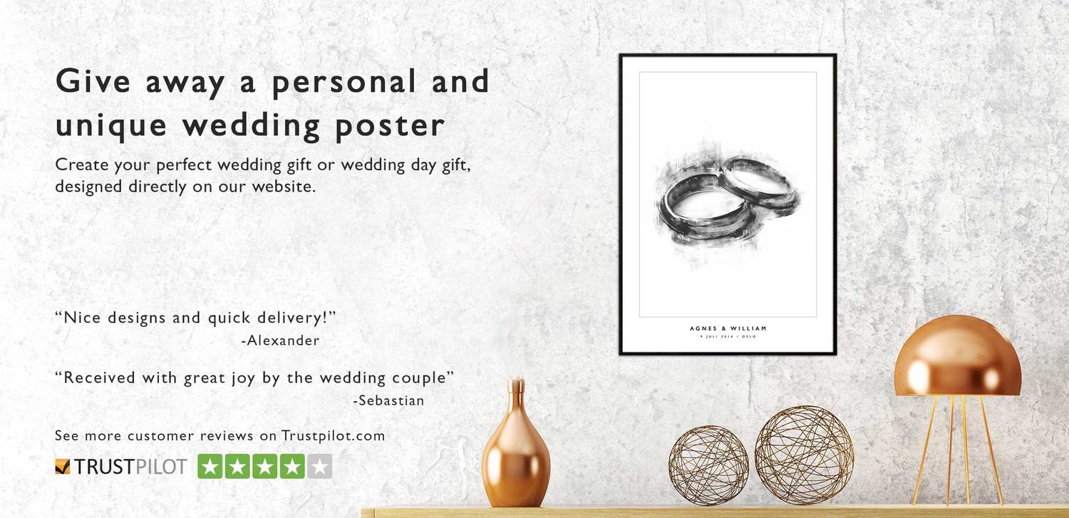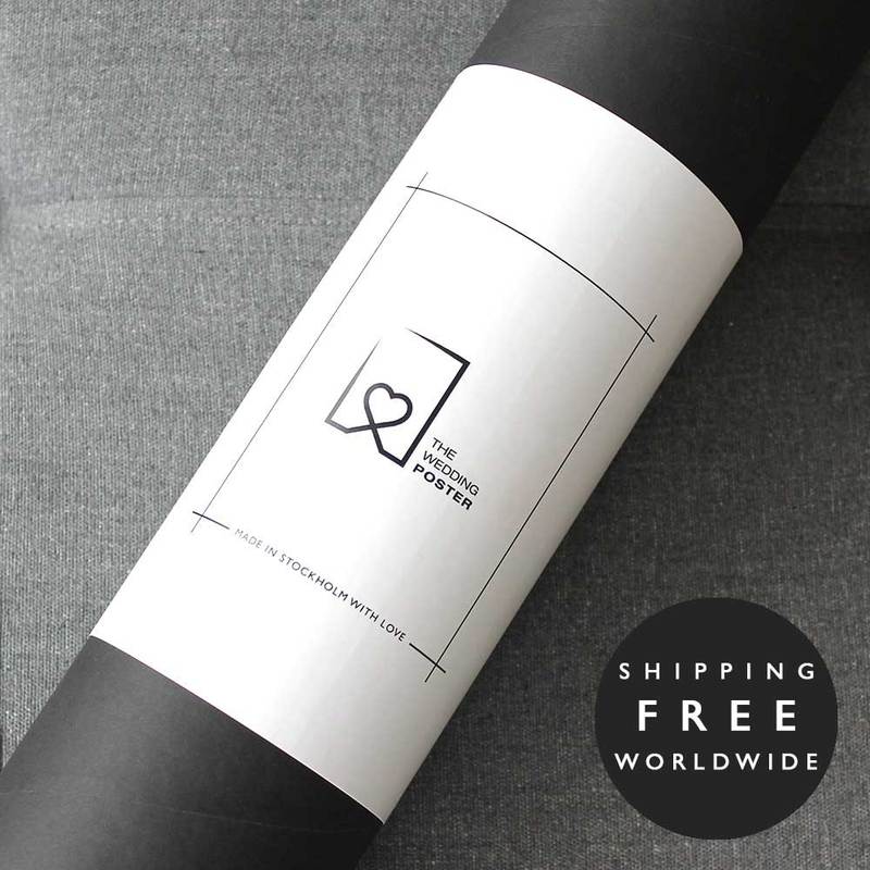 At The Wedding Poster we love Nordic design. We also love creative wedding gifts and home decor. We want to give you an alternative to traditional wedding gifts, to instead give away something personal and unique. Create your personalized wedding poster as a wedding or anniversary gift, or as a decor for your own wedding. Printed in Sweden on high-quality 200g/m2 matte paper, packaged as a ready wedding gift, delivered with free shipping worldwide, regardless of destination or order size.