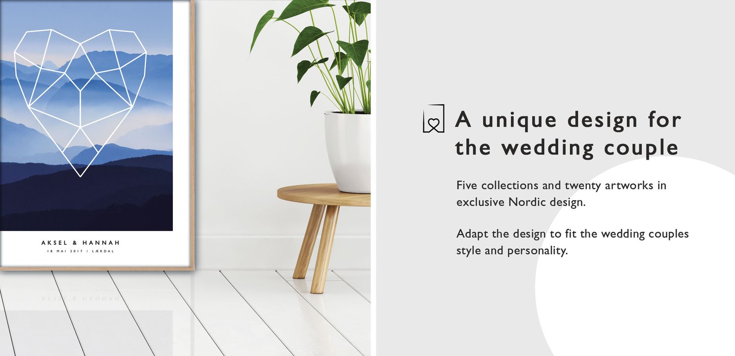 We want to offer an alternative to traditional wedding gifts that is both personal and unique. Our wedding art are created by artists from leading art faculties and our own skilled designers, always following the patterns of Nordic design. Through our platform we wish to provide you as an art print buyer the opportunity to design a wedding poster that fits both the style and personality of the wedding couple. Essentially a co-creative tool that engages both our artists and you in the process of creating beautiful and personalized wedding art. By doing this we hope to provide more personal and unique wedding gifts and less of the traditional and predictable kind.